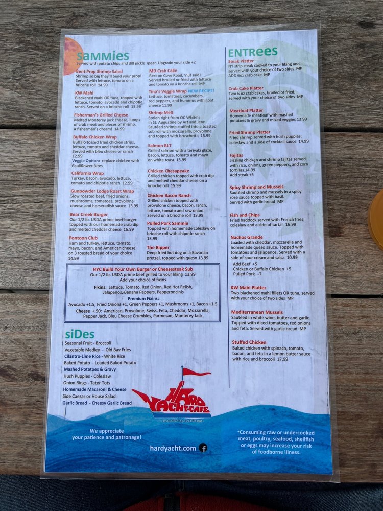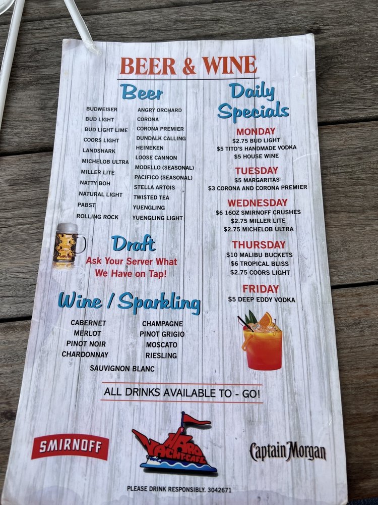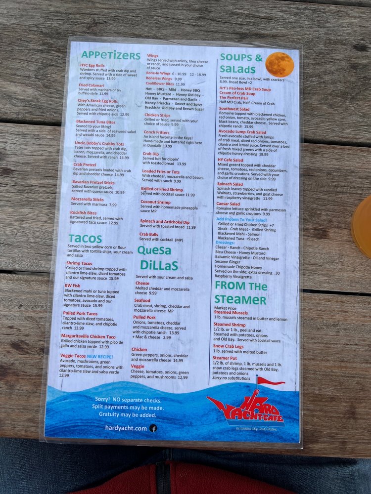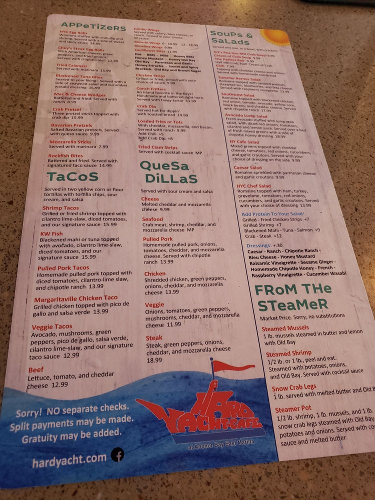 The Hard Yacht Cafe, located in Dundalk, MD, offers a diverse American menu with a focus on seafood and bar fare. Known for its casual and lively atmosphere, this restaurant provides a range of amenities including outdoor seating, live music, and happy hour specials. The menu features popular starters like wings, chicken strips, mozzarella sticks, and hush puppies. The seafood offerings from the steamer section, such as Margaritaville shrimp, Mediterranean mussels, steamed mussels, and snow crab legs, showcase the restaurant's commitment to quality and flavor. With a variety of vegetarian options and a welcoming environment for groups and families, The Hard Yacht Cafe is a must-visit spot for those seeking a fun dining experience by the water.